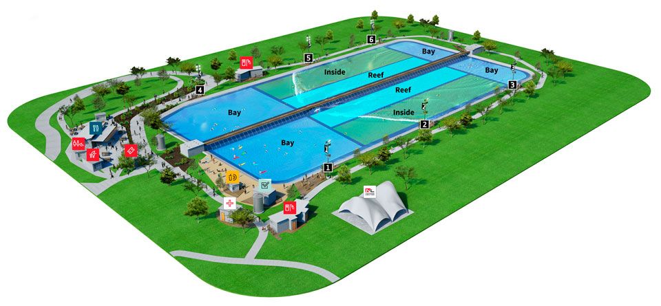The main attraction is the Reef, which is the wave just adjacent to the pier on either side. This is where the largest, most advanced waves in the pool will break. Surfers on either side of the pier alternate between going left and right as the wavefoil moves up and down the central pier.